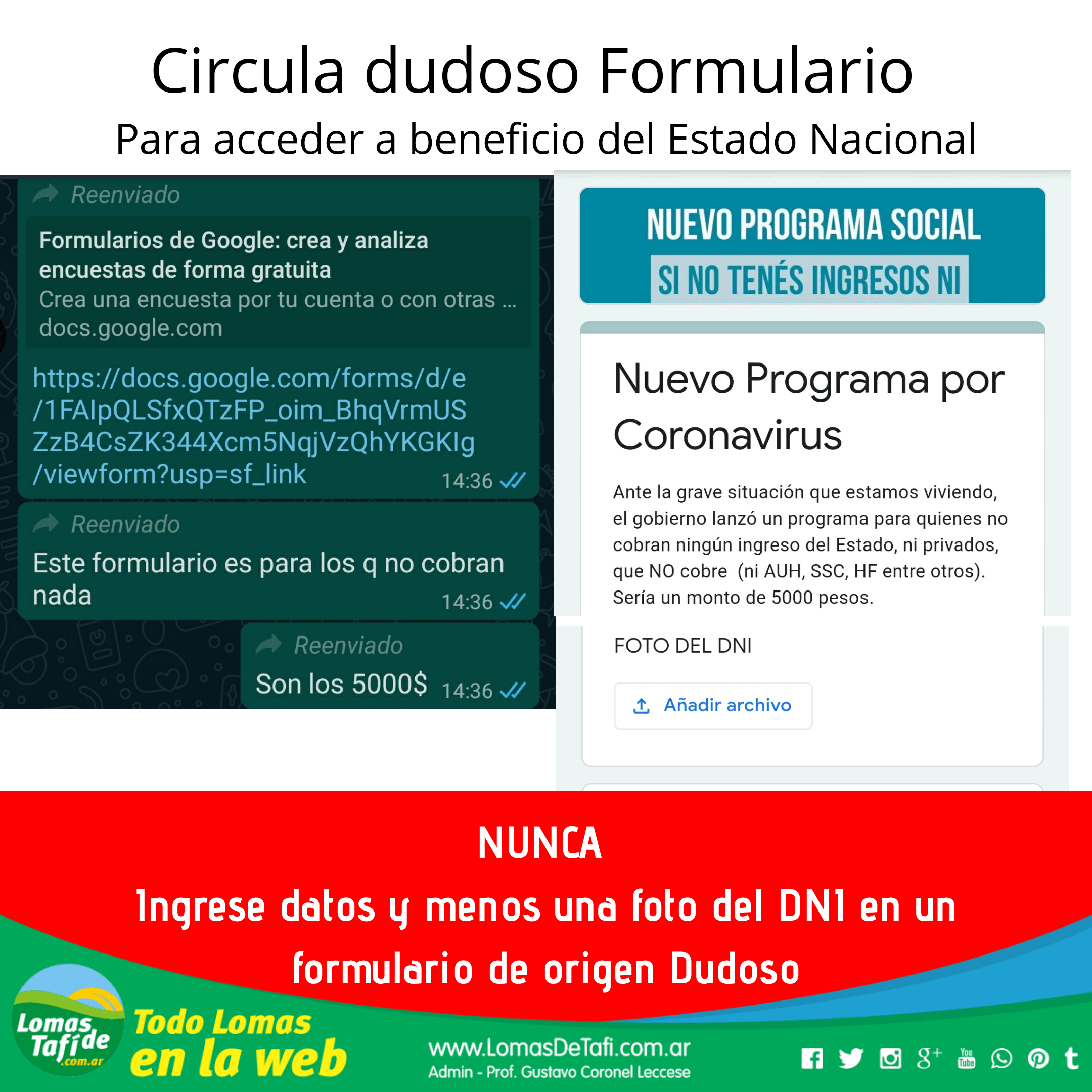 Circula dudoso Formulario, Para acceder a beneficio del Estado Nacional. NUNCAIngrese datos y menos una foto del DNI en un formulario de origen Dudoso.#QuedateEnCasa #YoMeQuedoEnCasa #LomasDeTafi