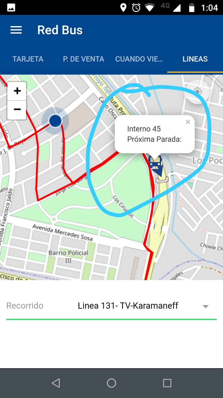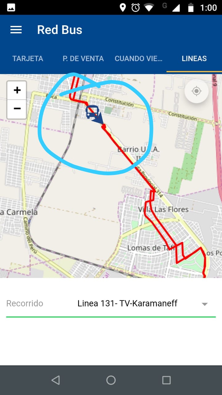 La vecina Cristina del Sector 15, espera el Colectivo de la Linea 131, que debe pasar, segun nos comenta entre las 12:53 y 12:57 por Av Raya y Tambor de Tacuarí, pero en el día de ayer, como en otros tanto no pasó. Ella estaba siguiendo al coche 45, por medio de la Aplicación Red Bus que permite hacer el seguimiento via GPS de los Coches.