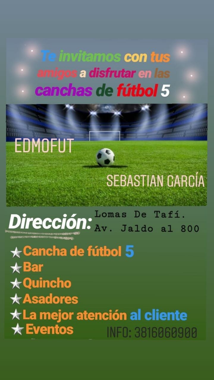 Veni a disfrutar con tus amigos a las canchas de EDMOFUT en Lomas de Tafi (JALDO LA 800).y Santiago 871 Alquiler de canchas ⚽, escuela de futbol ⚽,, torneos🏆TAMBIEN se alquila para eventos, ¡ LA MEJOR ATENCION AL CLIENTE!. Y ahora para pasar un momento genial te Ofrecemos cervezas artesales 🍻 Con la mejor Promo 2 × $150 hapy hasta la 22 de la noche 👌. Avenida Jaldo 800. Tel. 3816060900
