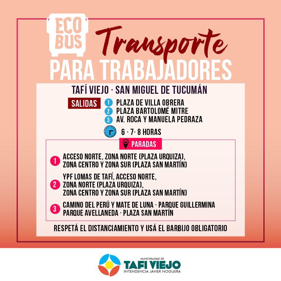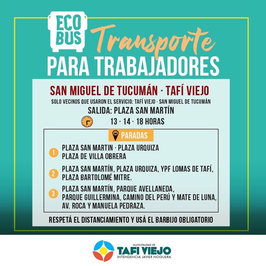 Los horarios de salida serán a las 6, 7 y 8 y tendrán como punto de partida: Plaza Bartolomé Mitre, Plaza de Villa Obrera, Manuela Pedraza y av. Roca. Las próximas paradas serán av. Alfonsín y colectora en Lomas de Tafí, Plaza Urquiza y Plaza San Martín.