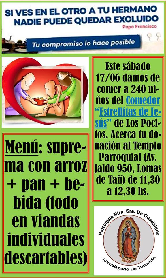 Aquellos que deseen colaborar puede acercar sus alimentos al Templo Parroquial ubicado sobre Av. Jaldo 9850 en Lomas de Tafi de 11:30 a 12:30hs. En esta ocasión el menú será de Suprema, Arroz, Pan y una bebida, se solicita dejarlo en viandas descartables individuales.