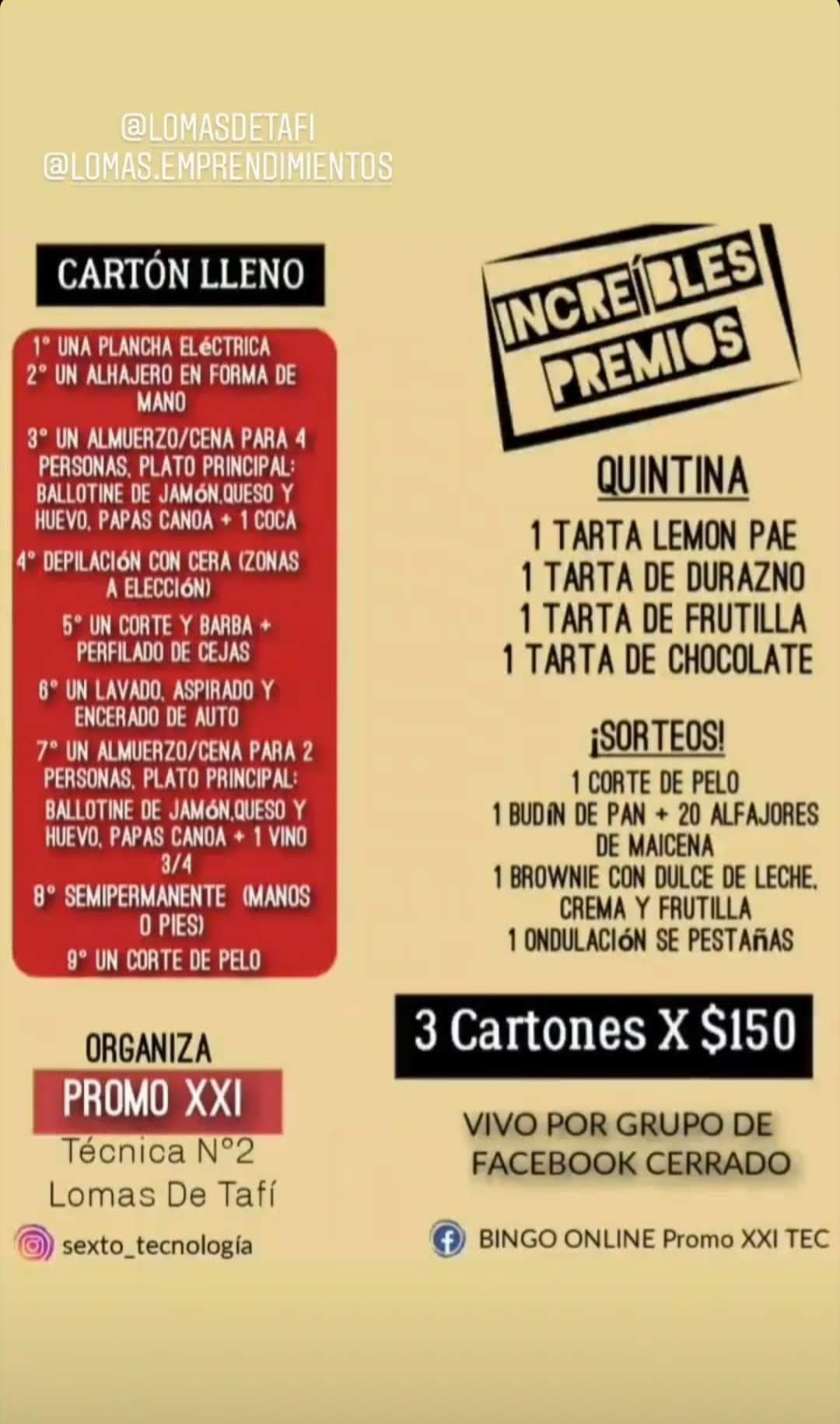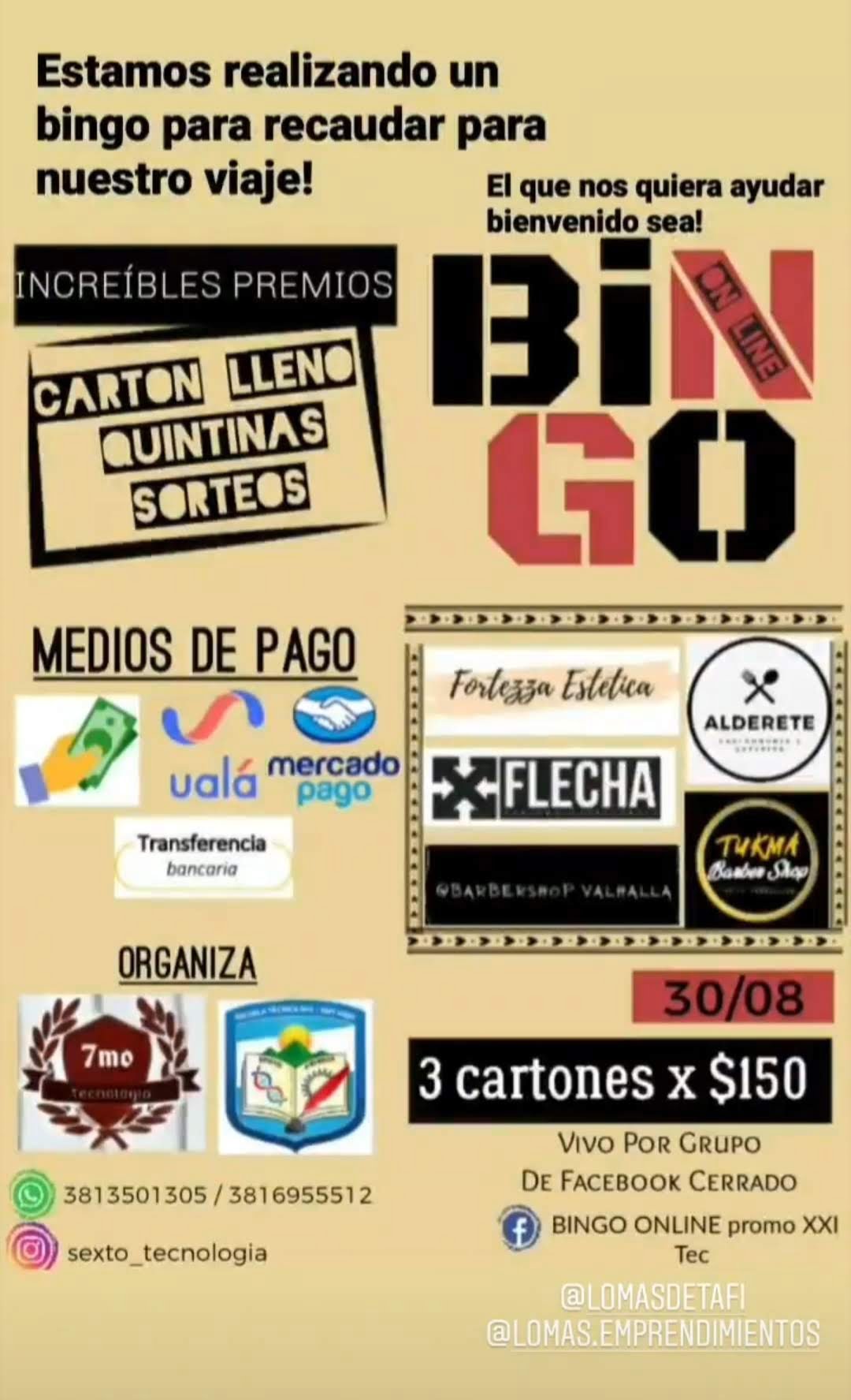 La Promo XXI de Tecnología de la Escuela Técnica N°2 de Lomas de Tafí, está organizando un BINGO ONLINE A Beneficio, la idea es ayudarlos a pagar su futuro viaje de Egresados.
