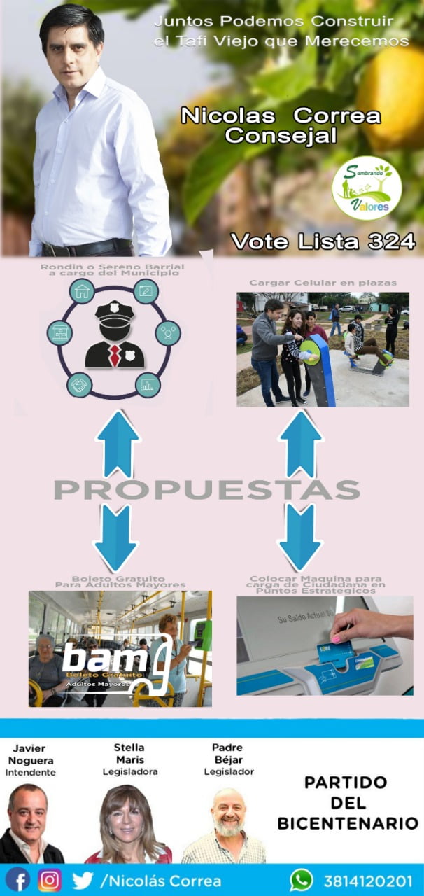 El candidato Nicolas Correa, por el partido Del Bicentenario, nos envió sus propuestas para darlas a conocer a la comunidad.