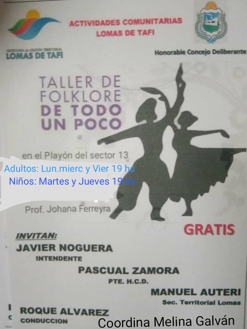 Desde la Municipalidad de Tafí Viejo y por medios de la Secretaría de Gestión Territorial de Lomas de Tafí, se realizan talleres Comunitarios Gratuitos, que comenzarán a partir de febrero. Los talleres que se ofrecen son: Taller de Folclore para Niños y Adultos : en el Playón de la Escuela del sector 13. Todos los…