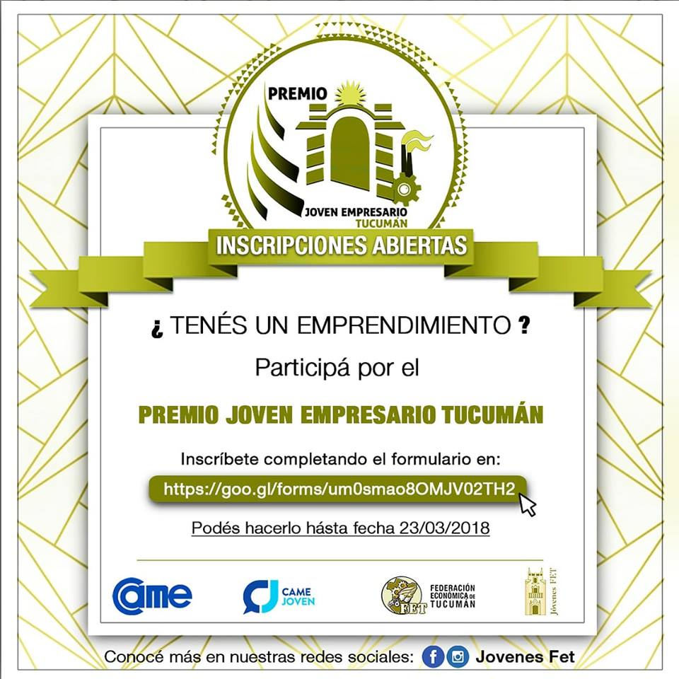 ¿Tenés un Emprendimiento? Ya te podés inscribir y participar por el #PremioJovenEmpresario 2018 organizado por Jovenes FET (Federación Económica de Tucumán) Ingresá en el siguiente link para realizar tu inscripción ☞ https://goo.gl/forms/um0smao8OMJV02TH2