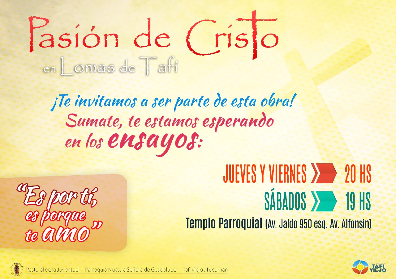 Los jóvenes de la Parroquia Nuestra Señora de Guadalupe, están a todo vapor con los ensayos para la puesta en escena de la “La Pasión de Cristo en Lomas de Tafí”, edición 2018. Los ensayos se ensayos se realizan los Jueves y Viernes a las 20hs y los días Sábados a partir de las 19hs….