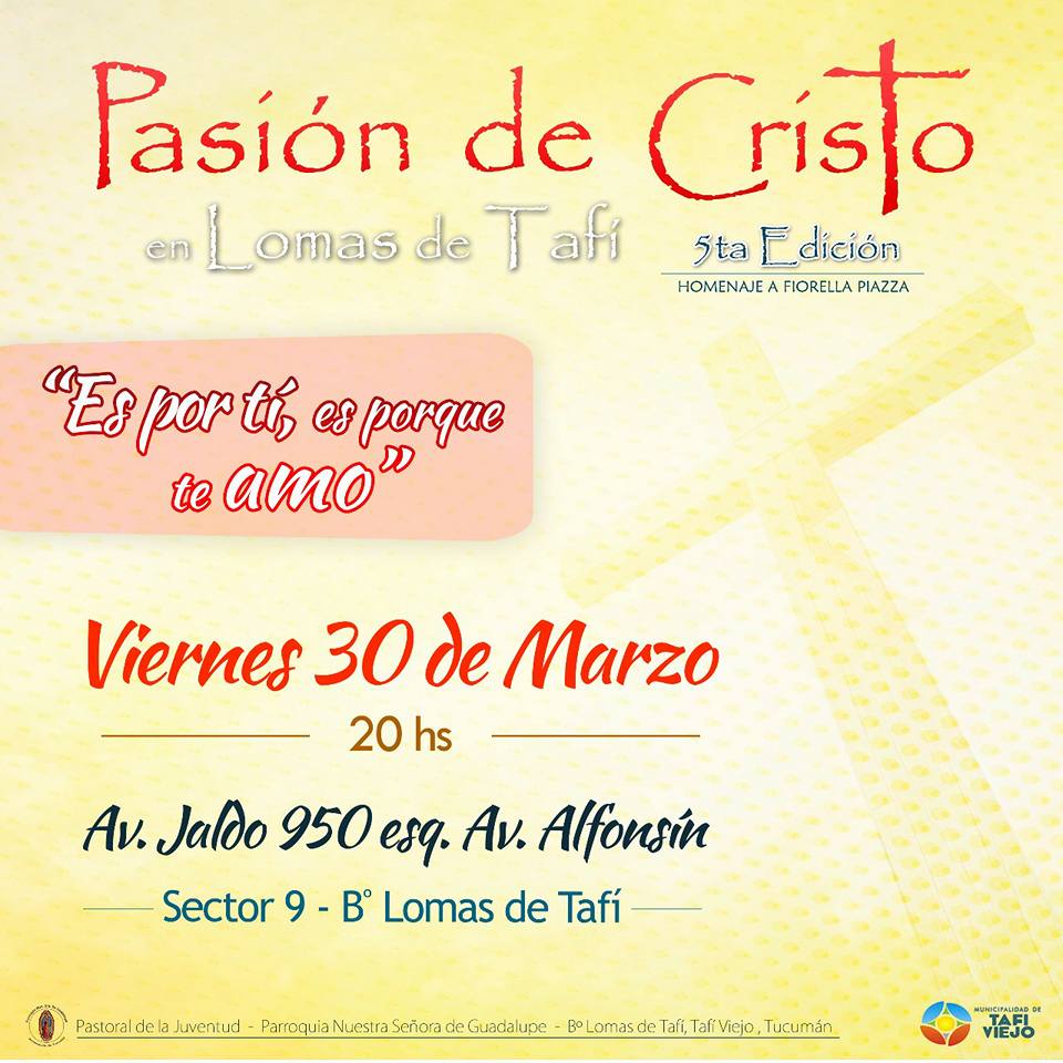El complejo habitacional Lomas de Tafí, será escenario por quinta vez consecutiva de la obra llevada adelante por integrantes de la Parroquia Nuestra Señora de Guadalupe, en esta oportunidad se desarrollará el viernes 30 de marzo a partir de las 20 horas en el predio ubicado en avenida Jaldo 950. La dirección de la puesta…