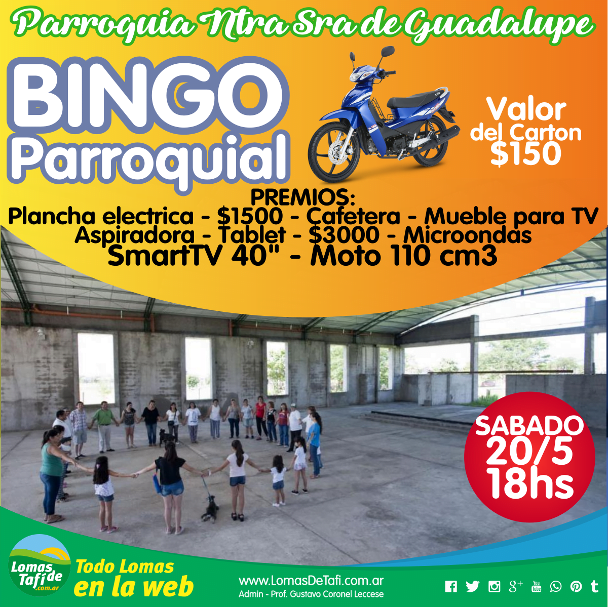 El 20 de Mayo por la tarde a partir de las 18hs. se realizará un Bingo que organiza la Comisión Protemplo Virgen de Guadalupe en beneficio de la construcción del Templo Parroquial de la Parroquia Nuestra Señora De Guadalupe, Lomas de Tafi. Se invita a la comunidad a Comprar, participar y colaborar en la Construcción…