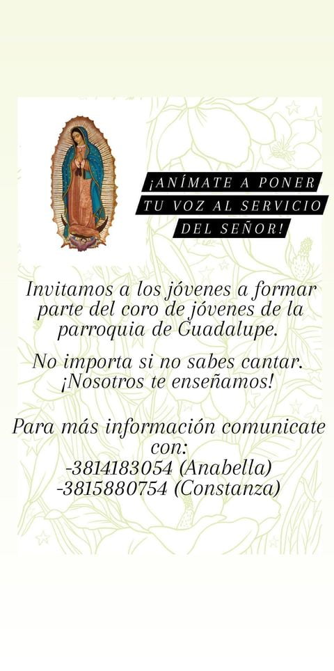 Se Invita a los jóvenes a formar parte del coro de jóvenes de la parroquia de Guadalupe. No importa si no sabes cantar. ¡Alli te enseñan! Para más información comunicate con: 3814183054 (Anabella) 3815880754 (Constanza)