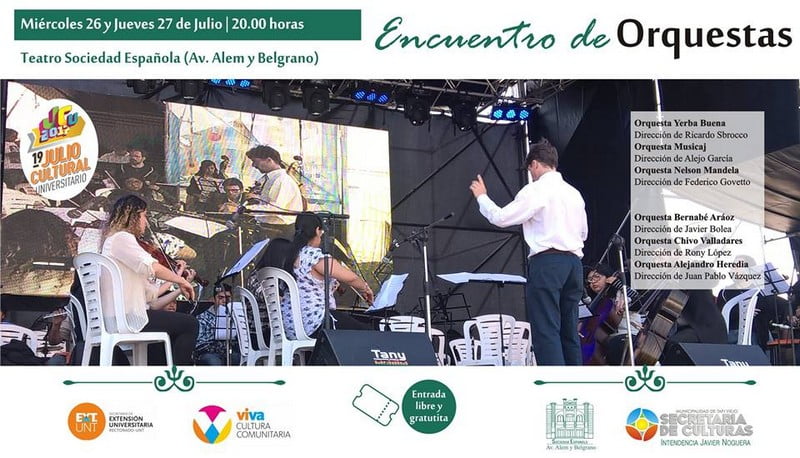 La propuesta, incluida en el 19º Julio Cultural Universitario, tendrá lugar mañana y el jueves en el teatro de la Sociedad Española, avenida Alem esquina Belgrano, a partir de las 20 horas. Programación: Miércoles 27: *Orquesta Yerba Buena Dirección: Ricardo Sbrocco. *Orquesta Musicaj Dirección: Alejo García. *Orquesta Nelson Mandela (de Lomas de Tafí) Dirección: Federico…