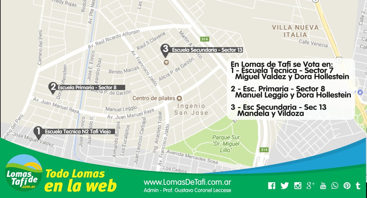 Las Escuelas habilitadas en Lomas son: Escuela Técnica – Sector 7 – Miguel Valdez y Dora Hollestein Escuela Primaria Lomas de Tafi Sector D – Sector 8 – Manuel Leggio y Dora Hollestein Escuela Secundaria -Sector 13 – Mandela y Vildoza ¿Cuándo y dónde voto ? Se realizarán el 26 de octubre, entre las 8…