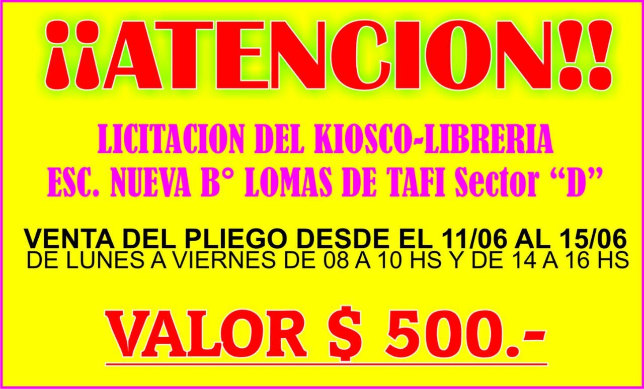 La Sociedad Cooperadora Escuela Nueva Barrio Lomas de Tafí Sector D (Sector 8) informa que se encuentra a la venta el pliego con bases y condiciones para la licitación del Kiosco de la Escuela. Los interesados en adquirir el pliego, pueden dirigirse a la Escuela, ubicada en el Sector 8, manzana 10, de lunes a…