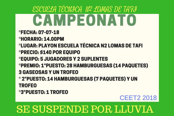 El Centro de Estudiantes de la Técnica 2 de Tafí Viejo, ubicada en Lomas de Tafí, invita a participar de la última actividad del hasta la vuelta de clases! El campeonato se realizará el sábado 7 de Julio a partir de las 14hs en el playon deportivo, de la Escuela Tecnica, la inscripción tiene un…