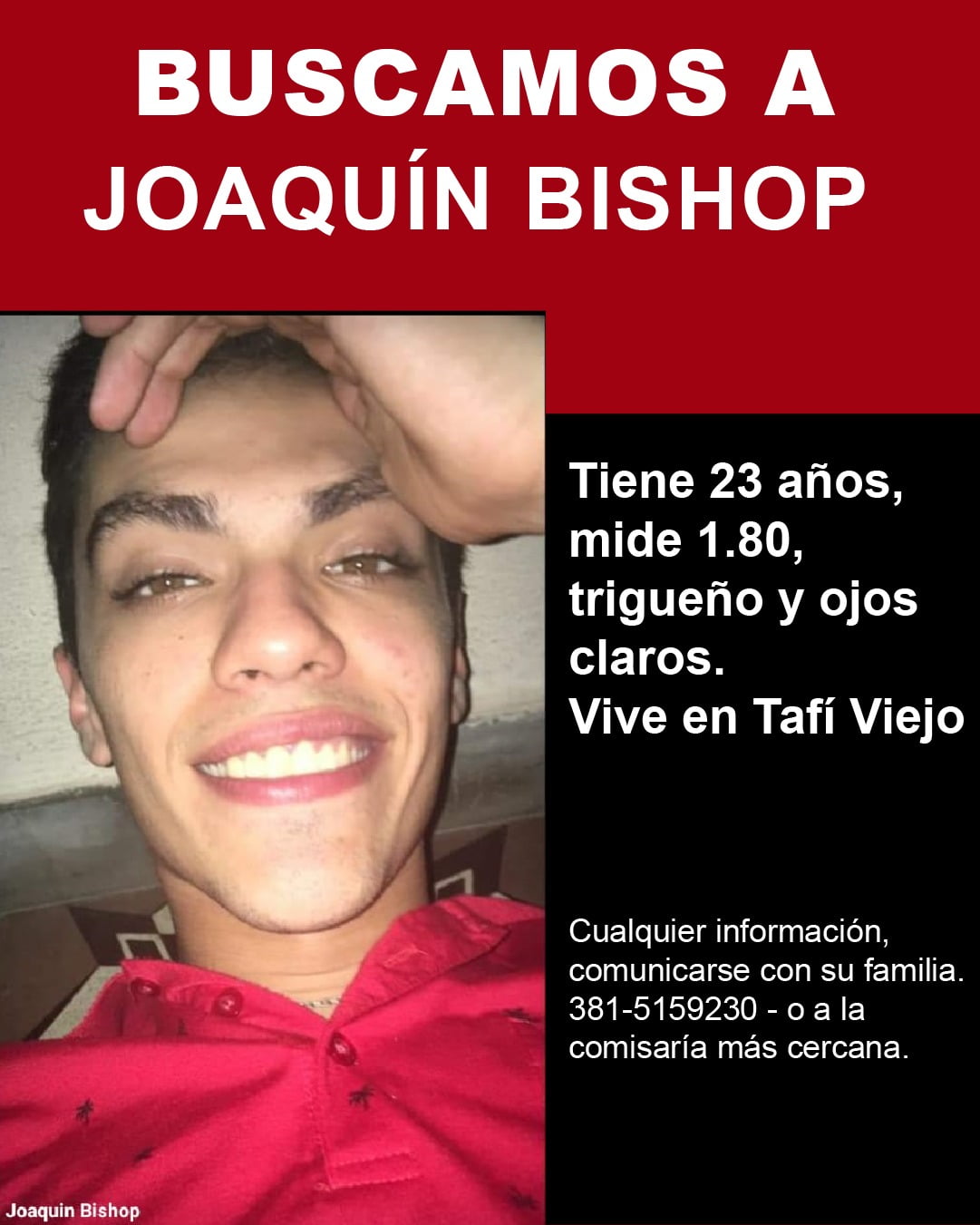 BUSCAMOS A JOAQUÍN BISHOP Tiene 23 años, mide 1.80, trigueño y ojos claros. Vive en Tafí Viejo Cualquier información, comunicarse con su familia 381-5159230-o a la comisaría más cercana.