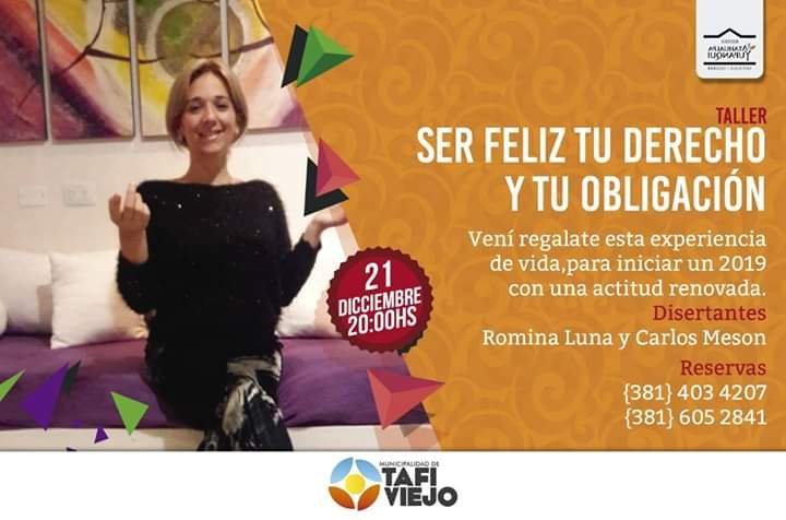 Se realizará un taller en Tafí Viejo, especial para esta época del año. 📅 Fecha: 21-12-18 ⌚ 20:00 📱 Reservas al: 03814034207 | 03816052841. ➡ Disertantes: Romina Luna y Carlos Mesón ⚜ Veni regalarte esta experiencia de vida,para iniciar un #2019 con una actitud renovada. ¿Qué vas a recibir ? 1⃣ identificar los pensamientos, emociones…