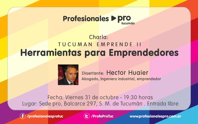 Profesionales PRO nos hizo llegar una invitación para una charla en el marco del Tucuman Emprende 2, llamada «Herramientas para Emprendedores», a cargo de Hector Huaier, se desarrollará hoy Viernes 31 a partri de las 19:30 hs. en Balcarse 297, la entrada es Libre y Gratuita.