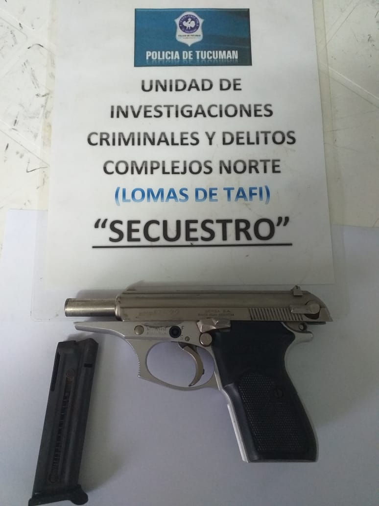 Se logra darles alcance, y en presencia de testigos, se procede al Secuestro del arma en cuestion, oculta en un panel del techo, lado del conductor.