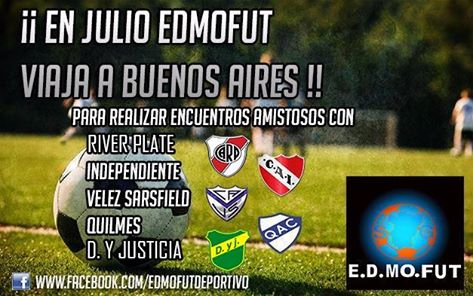 El dia 9 de julio de 2017 partimos a Buenos Aires, para jugar partidos amistosos con clubes de gran prestigio internacional como ser River Plate, Velez Sarfield, Independiente, Quilmes, y Defensa y Justicia. Ademas compartiremos jornadas recreativas y también tratando de educar a través del deporte con disciplina, esfuerzo, alimentación, tratando así de lograr la cohesión de los grupos deportivos, teniendo como prioridad el cuidado y el seguimiento personalizado de los niños.