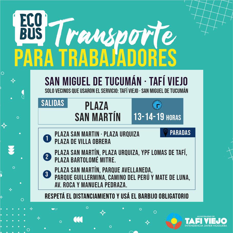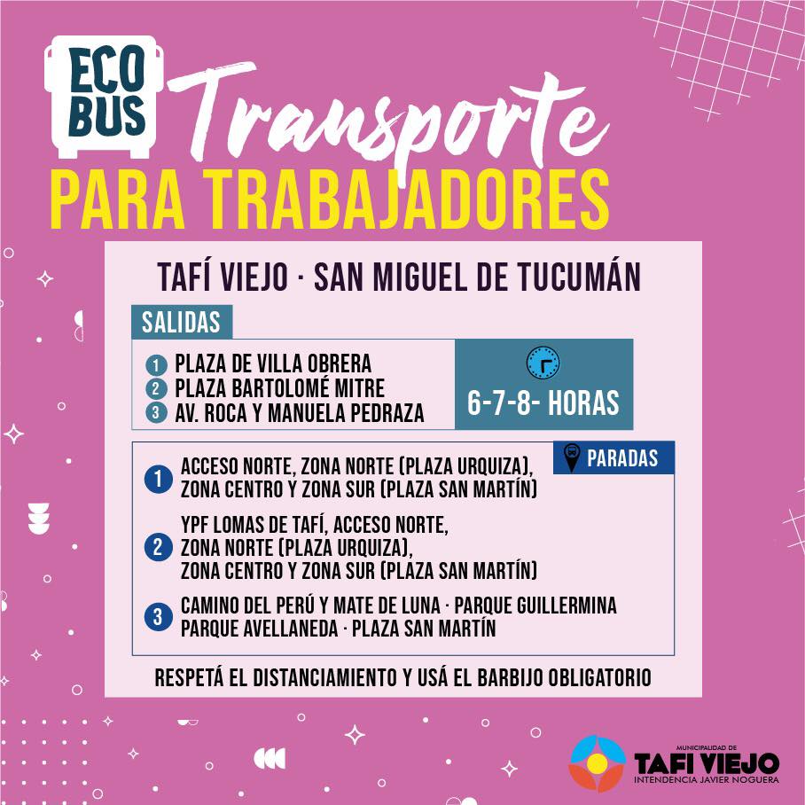 Debido a un nuevo paro de colectivos por parte de UTA la Municipalidad de Tafí Viejo pondrá a disposición de los taficeños el servicio de los Ecobuses. El transporte alternativo para trabajadores que se trasladan a San Miguel de Tucumán brindará mañana su servicio para garantizar la asistencia a los puestos de trabajo de estos vecinos.