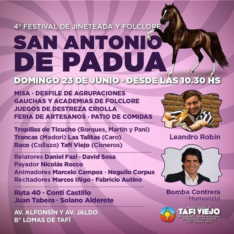 Las actividades en honor al santo patrono de Tafí Viejo, San Antonio de Padua, continuarán el próximo domingo en Lomas de Tafí. Por cuatro año consecutivo se realizará en el barrio el tradicional festival de Jineteada y folclore, en la intersección de las avenidas Alfonsín y Jaldo.