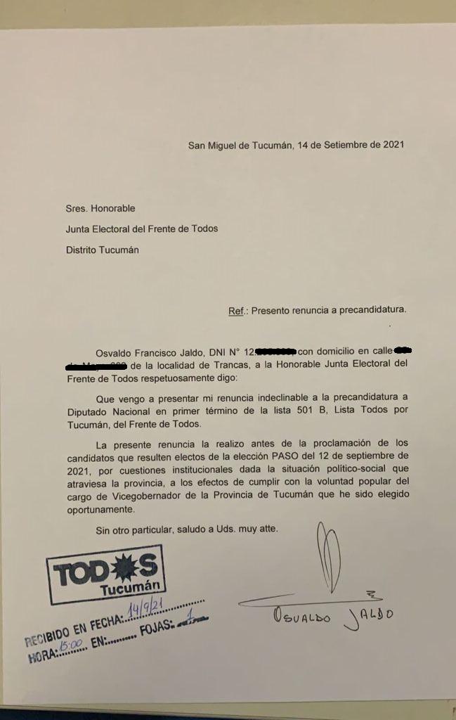 El vicegobernador Osvaldo Jaldo presentó esta tarde su renuncia “indeclinable” como precandidato a diputado nacional por la lista “Todos por Tucumán” del Frente de Todos. La nota ingresó a la Junta Electoral del Frente de Todos pasadas las 15. El presidente de la Cámara adujo cuestiones “institucionales” debido a la situación por la que atraviesa la provincia y para cumplir con la “voluntad popular” que lo consagró como vicegobernador.