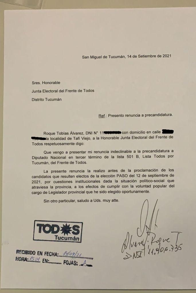 Con una nota idéntica, también dimitió quien también formaba parte de la lista jaldista, el legislador Roque Álvarez. De esta manera, el hombre que sigue en la nómina y que reemplazará a Jaldo por la ley de Paridad es Agustín Fernández. El dirigente y ex intendente de Aguilares ingresaría al armado que encabeza la ministra de Salud Rossana Chahla.