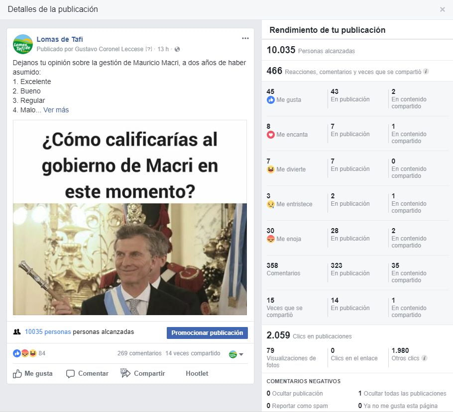 Nosotros desde nuestro www.Facebook.com/lomasdetafi, lanzamos una encuesta en el día de ayer, donde por abrumadora mayoría dijeron que la Gestión actual esta entre «Mala» y «Pésima«, lo que para muchos es una sorpresa teniendo en cuenta que en las ultimas elecciones, Cambiemos se impuso al Peronismo en las mesas de Lomas de Tafí.