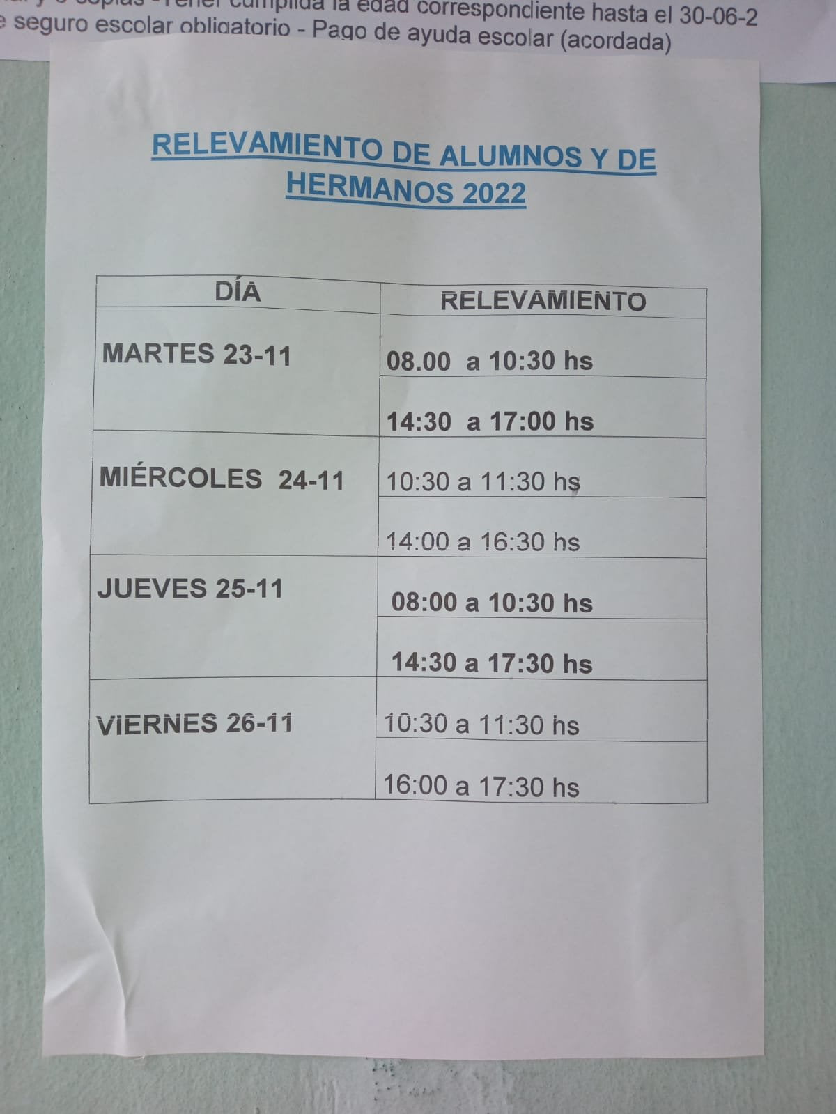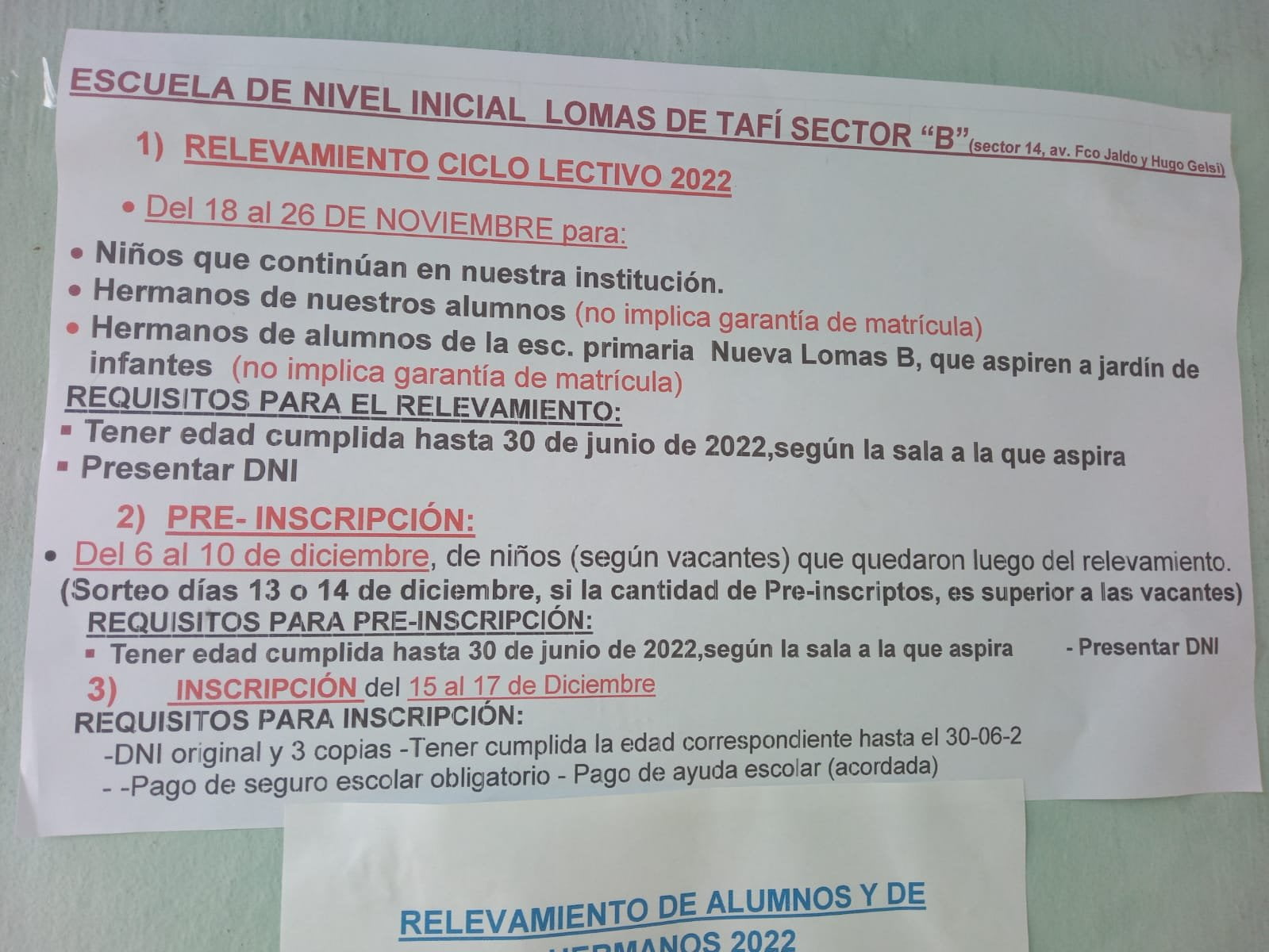 La Sra Directora de la ESCUELA DE NIVEL INICIAL LOMAS DE TAFÍ SECTOR «B» (sector 14, av. Fco Jaldo y Hugo Gelsi) nos informa que comienza el relevamiento para el ciclo 2022.