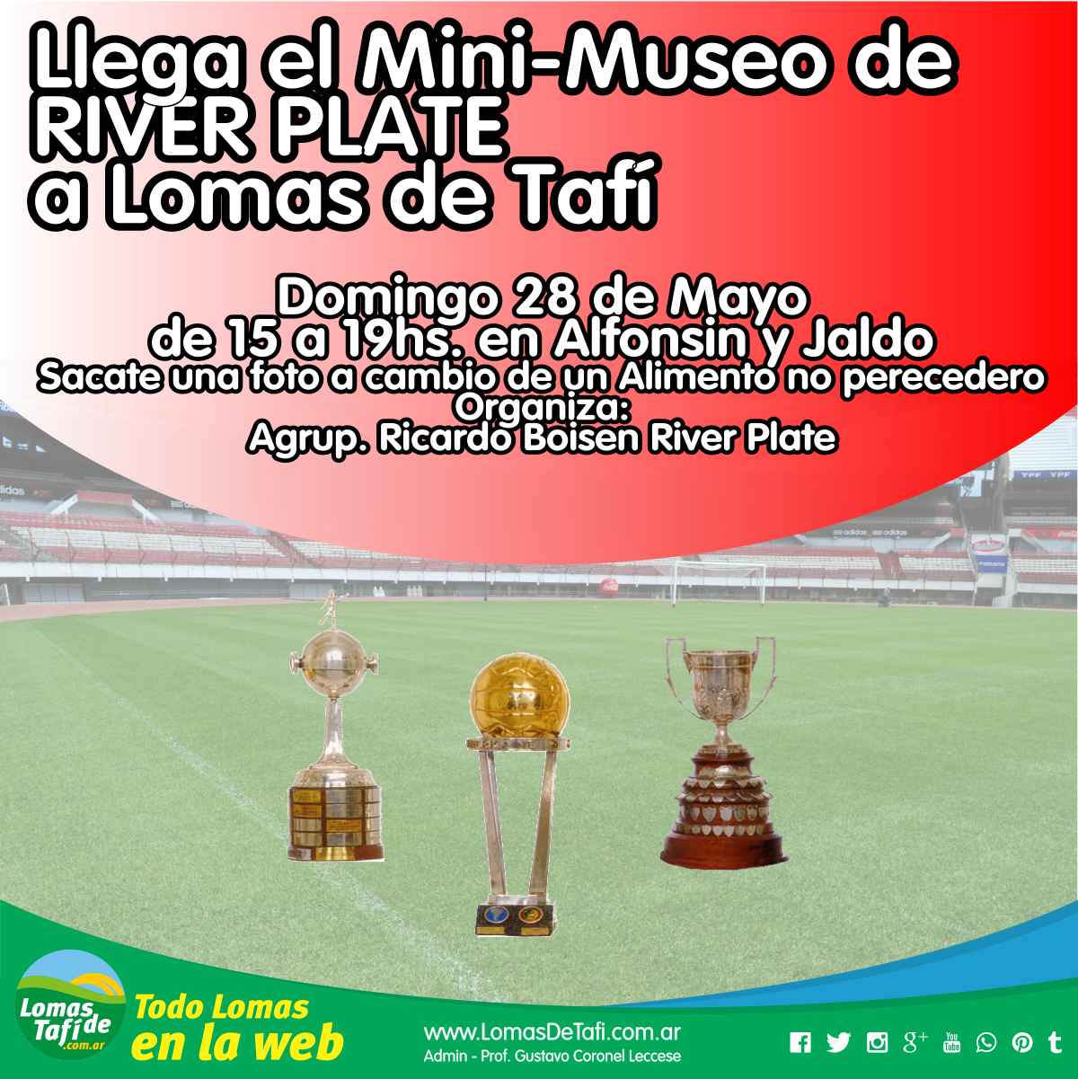 Según se informa en el Facebook de la Municipalidad de Tafí Viejo, el próximo Domingo 28 de Mayo a partir de las de 15 y hasta las 19hs se expondrá el Mini Museo del Club River Plate en Lomas de Tafí, mas precisamente en la esquina de Av. Alfonsin y Av Jaldo.
