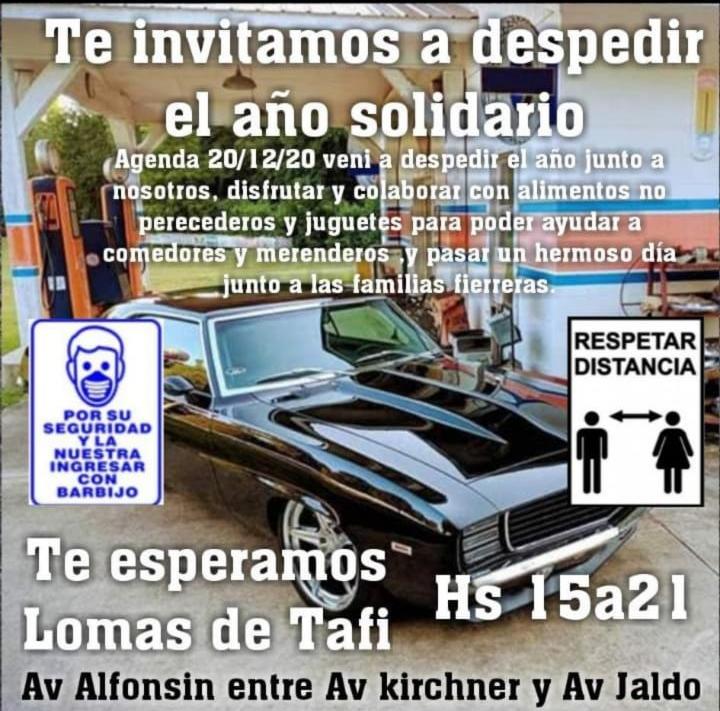 El domingo de 16 a 21 horas en Av. Jaldo y Av. Alfonsín (Lomas de Tafi) expondrán autos clásicos y tuning, motos y Audio Car. Será un evento solidario que reunirá diversos clubes de la provincia. La entrada será alimentos no perecederos o juguetes. Además habrá música, sorteos y stand de comidas.