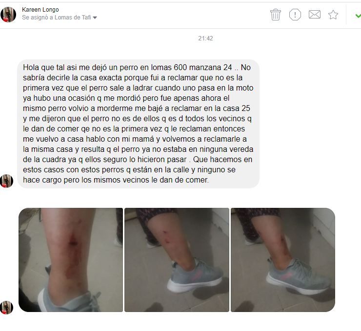 Periódicamente nos llegan mensajes de vecinos que son atacados por Perros de la calle en nuestra querida Lomas de Tafí, lamentablemente el Estado no se hace cargo, ya sea de multar a quienes dejan los perros ni de llevar a los que son peligrosos para la comunidad.