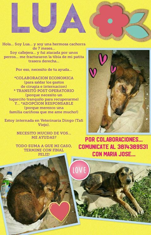 Según nos cuenta «Fue atacada por unos perros, y le fracturaron la tibia de su patita trasera derecha… necesita mucha ayuda. En cuanto a lo económico (para saldar sus gastos de cirugía en internación), Tránsito (para hacer su post operatorio) y Adopción (porque merece una familia que la ame)… Lo que puedan ayudar, es bienvenido. Quiero devolverle la alegría a ella… que tiene hoy, una carita terrible de tristeza y maltrato. Como siempre digo… todo animal que yo rescate, nunca volverá a ser de la calle. Por cualquier consulta o colaboración, comunicarse al 3814389531, conmigo, Maria Jose. Ella está internada en Veterinaria Dingo de Tafi Viejo. Desde ya, muchas gracias… en nombre de Lua y en el mio también! (Maria Jose.-)»