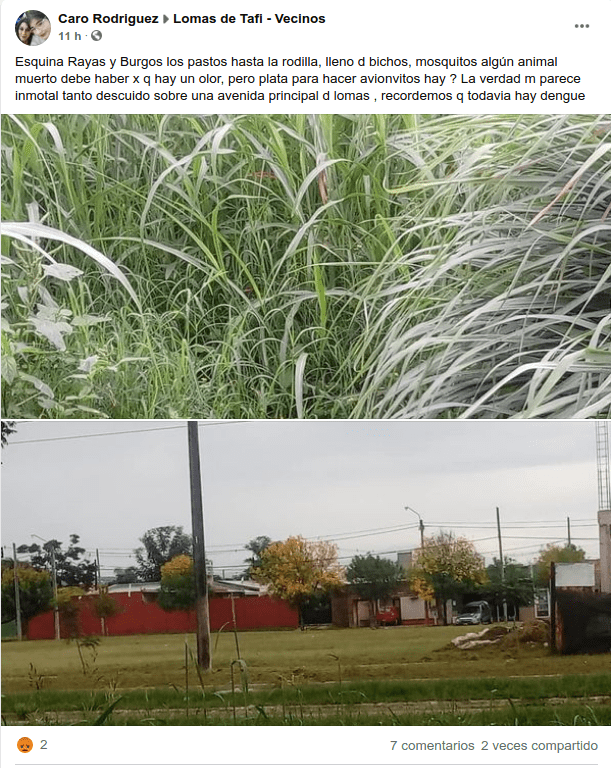 La vecina Caro Rodriguez, publicó en Facebook, un reclamo por el estado de la Esquina Rayas y Burgos, donde los pastos están muy altos, y la zona esta colmada de insectos.