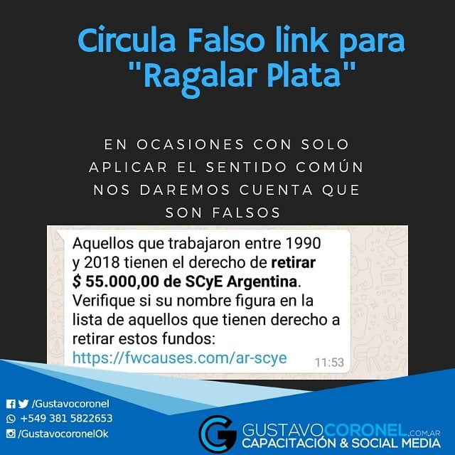 Mucho cuidado con el FALSO mensaje que circula por whatsapp. El mensaje en cuestión indica que: “aquellos que trabajaron entre 1990 y 2018 tienen el derecho de retirar $ 55.000,00 de SCyE Argentina. Verifique si su nombre figura en la lista de aquellos que tienen derecho a retirar estos fondos» Luego, hay un enlace a…